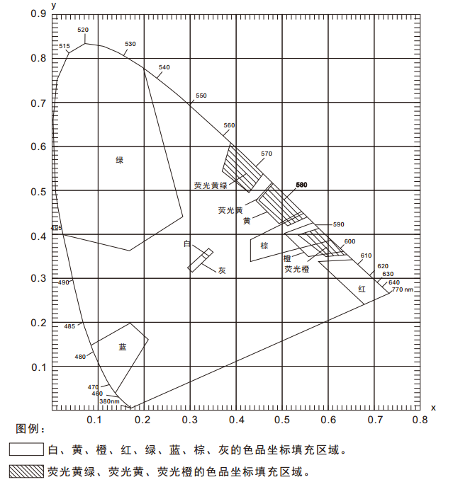 在《GB 2893安全色》、《GB/T 18833道路交通反光膜》等相關標準中,通常給出一塊顏色區域(多個色品坐標點)和亮度因數要求,在D65/A光源和45/0幾何條件下,判定樣品是否落在對應的顏色區域內,借此判定樣品是否滿足標準規定的色度要求。由於顏色區域為多邊形,如下圖所示,導致使用普通的分光測色儀無法完成判定。NS808測色儀配合SQCT軟件的交通路標測量模塊則可以輕鬆解決這方麵的問題。