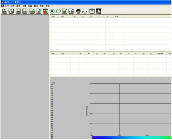 NS808的交通路標測試模塊主要是通過上位機軟件SQCT配合NS808儀器實現的。使用前需先安裝好SQCT上位機軟件,再連接NS808儀器,然後打開上位機軟件,默認為普通測試界麵,如圖1所示,在該界麵下可以完成CIE L*a*b、XYZ、ΔE*ab、ΔE*cmc、ΔE*00等色度數據的測試,詳細菜單和工具欄的介紹請參照該軟件自帶“色彩管理控製軟件使用說明書”,這裏重點介紹交通路標測試模塊。