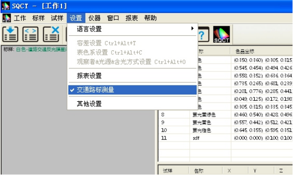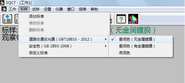 SQCT直接將《GB/T 18833-2012道路交通反光膜樣》的多邊形顏色區域做入軟件中,可以直接從菜單中選擇,“標樣->道路交通反光膜GB/T 18833->晝間色(無金屬鍍膜)”如圖11所示。