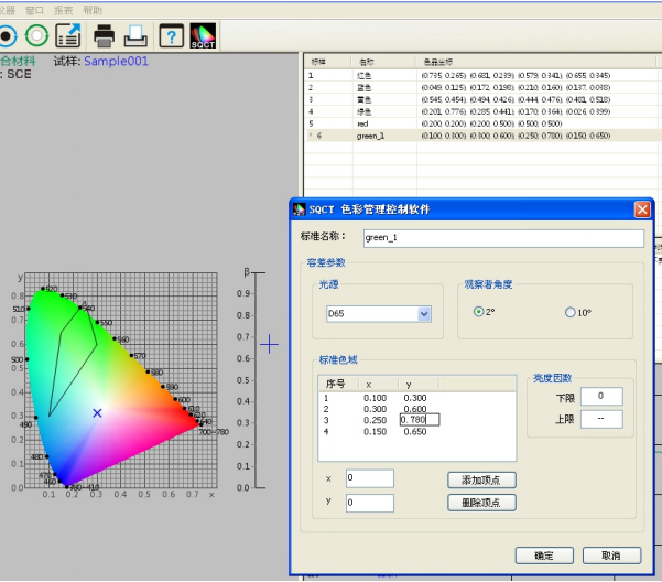 如圖7所示,修改上麵建立的名稱為“green”的多邊形-容差標樣,先選中該標準,然後可 以修改“標準名稱”“光源”“ 標準觀察者角度”“亮度因數”“色品坐標”,修改完畢,點擊“確定”按鈕,則修改生效。