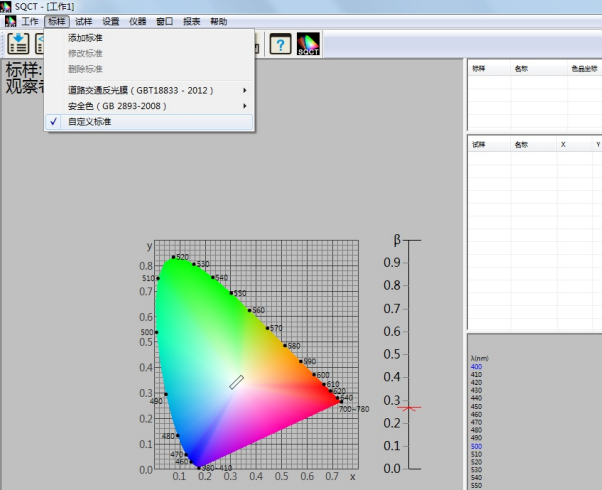 針對國內交通路標使用較多的標準GB/T 18833,SQCT軟件將該標準中的標準色域納入其中,客戶隻需根據自己需要進行選擇即可。