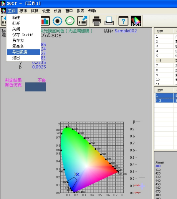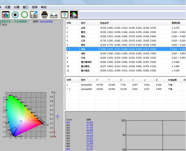 譬如如何判定藍色試樣是否在《GB/T 18833-2012道路交通反光膜樣》所規定的藍色區域內(無金屬鍍層,晝間反光膜顏色),按照下麵的步驟,將依次完成測量和判定。