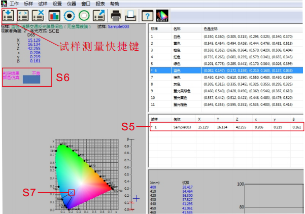 將測試樣品放在NS808測量口徑上,貼緊,鼠標點擊試樣測試快捷工具,如圖13所示。大約1.5秒時間,完成測試,測試數據如圖13中S5所示,在色品坐圖中的位置如S7所示,仿真及判定結果如S6部分所示。